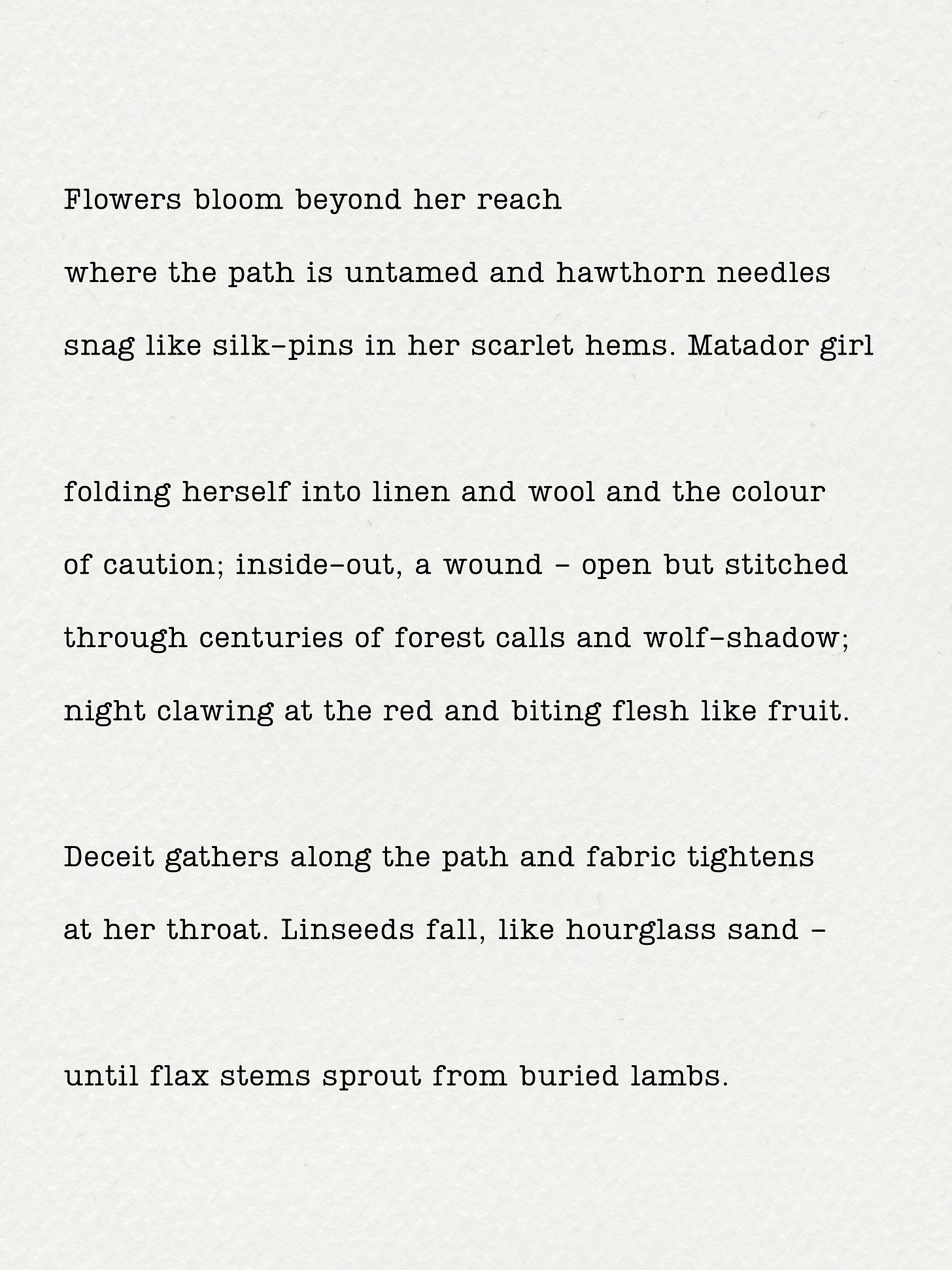 Little red riding hood on her way to grandma's house (old age?) as innocence is tested, threatened. I feel a melancholy infused with a gentle heroism. I think that's why I say it's a lovely poem.